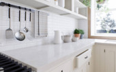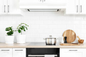 Białe nowoczesne wnętrze kuchni z drewnianym blatem i przyborami kuchennymi, koncepcja kulinarna, tło