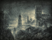 Nawiedzony krajobraz z ciemnymi drzewami i gotyckim budynkiem, pranie tuszem na papierze.