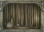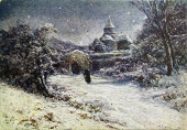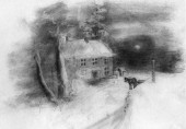Stary wiejski dom i drzewa na nierównym terenie, tempera na papierze.