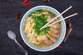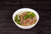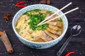Zupa makaronowa z kawałkami wołowiny i wieprzowiny z zielenią