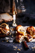 Zdjęcie "Tradycyjne polskie ciasto babka z orzechem włoskim. Martwa natura wirującego brioche lub plecionego chleba orzechowego na ciemnym, teksturowanym stole" może być wykorzystywane do celów osobistych i komercyjnych zgodnie z warunkami zakupionej licencji Royalty-free. Obraz jest dostępny do pobrania w jakości wysokiej rozdzielczości do 5760x3840.