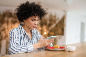 Portret młodej, pięknej, afrykańskiej kobiety korzystającej z telefonu komórkowego podczas lunchu w kawiarni