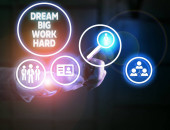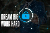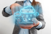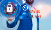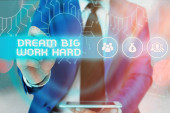 Koncepcyjny ręczne pisanie pokazując Dream Big Work ciężko. Prezentacja zdjęć biznesowych Uwierz w siebie i podążaj za marzeniami i celami.