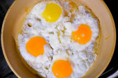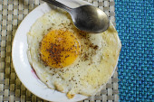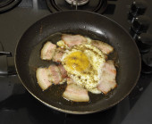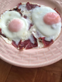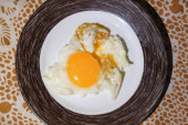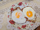 domowe śniadanie ze smażonych jaj z dwóch jaj i kawałek smażonego mięsa na talerzu