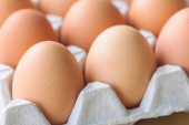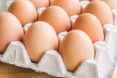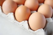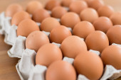 Jaja w pudełku na drewnianym tle / Zbliżenie surowych jaj kurzych żywności ekologicznej, selektywne skupienie