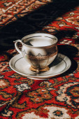 vintage sowieckie filiżanki porcelany herbaty ze spodkami na tureckim dywanie, tradycyjna ceremonia herbaty, światło słoneczne z głębokimi cieniami