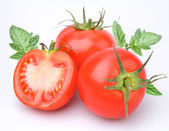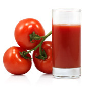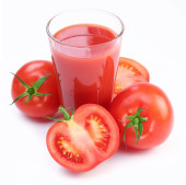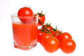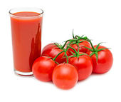 kieliszek soku pomidorowego i dojrzałe pomidory na białym tle