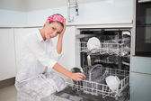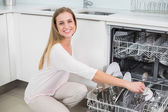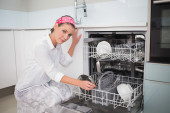 dorywczo szczęśliwą kobietą, biorąc blachę z piekarnika