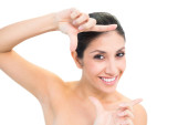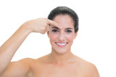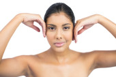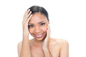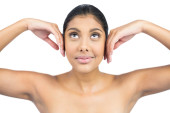 szczęśliwy brunetka nago z spódnica dotykając czołem