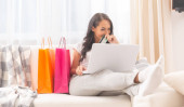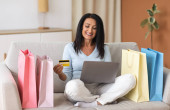 Urocza kobieta leżąca na podłodze salonu, trzymająca tablet i kartę kredytową, patrząca i uśmiechnięta na dwie białe papierowe torby na zakupy obok niej.