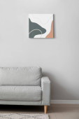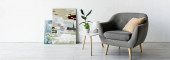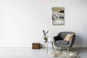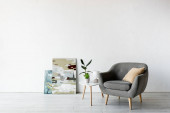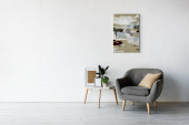 szary fotel przy stoliku kawowym z ramami i zielonymi roślinami w pobliżu malowania na ścianie w nowoczesnym salonie