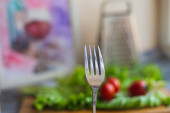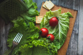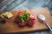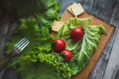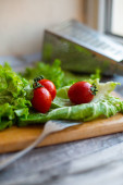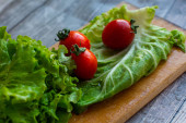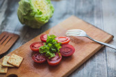 pomidory wiśniowe z kapustą i sałatką na desce do krojenia