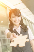 biznes kobieta posiadają drewniane puzzle
