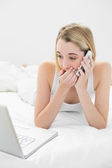 piękna blond kobieta dzwoniąc spokojnie leżącego na łóżku