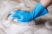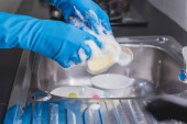 Zdjęcie "Blisko mężczyzny w niebieskiej gumowej rękawiczce mył kubek płynem do mycia naczyń w zlewie w kuchni." może być wykorzystywane do celów osobistych i komercyjnych zgodnie z warunkami zakupionej licencji Royalty-free. Obraz jest dostępny do pobrania w jakości wysokiej rozdzielczości do 5760x3840.