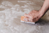 Blisko mężczyzny w niebieskiej gumowej rękawiczce mył kubek płynem do mycia naczyń w zlewie w kuchni.
