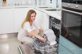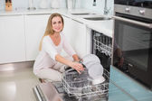 portret uśmiechający się człowieka za pomocą zmywarka do naczyń w kuchni