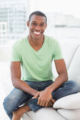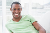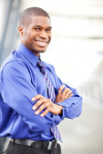 elegancki uśmiechający się biznesmen afro stoi w biurze
