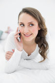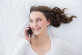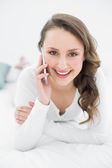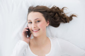 młoda brunetka przy użyciu telefonu komórkowego w łóżku