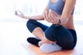 stonowanych kobieta siedzi w lotosu stanowią w fitness studio