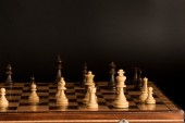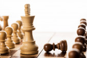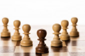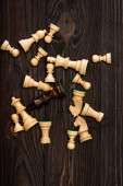 Widok z góry unikalny brązowy król z białymi pionkami szachowymi na drewnianym tle