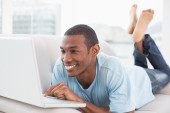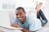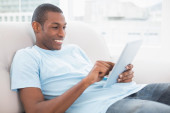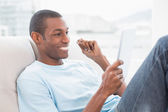 widok z boku dorywczo afro człowieka za pomocą cyfrowego tabletu na kanapie