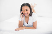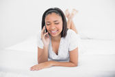 uśmiechający się przy użyciu telefonu komórkowego w łóżku