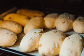 Chleb z ziarna Artisan. Rustykalny bochenek domowego chleba, syn ciemnego drewnianego stołu. Domowej roboty bochenek chleba z przyprawami. Widok z góry. Odpowiednie miejsce do badania