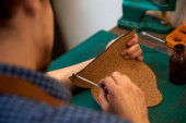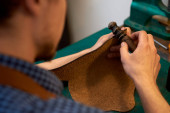 Zbliżenie rąk rzemieślnika szycie brązowych skórzanych części z igłą na przyszły futerał na okulary. Człowiek z igłą szyjący skórę w warsztacie. Rzemieślnik pracujący z brązową skórą, igłą i nitką. Zdjęcie można wykorzystać do robótek ręcznych