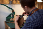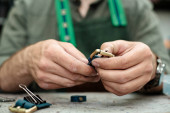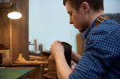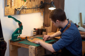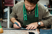 Zdjęcie "Zbliżenie rąk rzemieślnika szycie brązowych skórzanych części z igłą na przyszły futerał na okulary. Człowiek z igłą szyjący skórę w warsztacie. Rzemieślnik pracujący z brązową skórą, igłą i nitką. Zdjęcie można wykorzystać do robótek ręcznych" może być wykorzystywane do celów osobistych i komercyjnych zgodnie z warunkami zakupionej licencji Royalty-free. Obraz jest dostępny do pobrania w jakości wysokiej rozdzielczości do 5760x3840.
