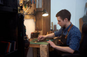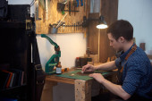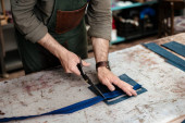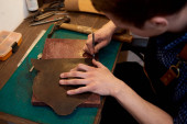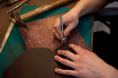 Zdjęcie "Zbliżenie rąk rzemieślnika szycie brązowych skórzanych części z igłą na przyszły futerał na okulary. Człowiek z igłą szyjący skórę w warsztacie. Rzemieślnik pracujący z brązową skórą, igłą i nitką. Mały interes rzemieślnika.." może być wykorzystywane do celów osobistych i komercyjnych zgodnie z warunkami zakupionej licencji Royalty-free. Obraz jest dostępny do pobrania w jakości wysokiej rozdzielczości do 5760x3840.