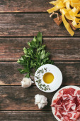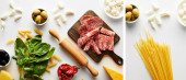 Widok z góry spaghetti, talerz mięsa, liści bazylii i składników na białym tle