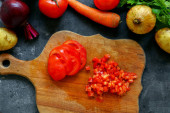 Zdjęcie "Świeże zdrowe warzywa do sałatki. Pomidory wiśniowe i pietruszka, koperek. Deska do krojenia. Mroczne tło. Wolne miejsce na tekst. Żywność" może być wykorzystywane do celów osobistych i komercyjnych zgodnie z warunkami zakupionej licencji Royalty-free. Obraz jest dostępny do pobrania w jakości wysokiej rozdzielczości do 5760x3840.