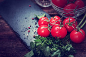 Świeże zdrowe warzywa do sałatki. Pomidory wiśniowe i pietruszka, koperek. Deska do krojenia. Mroczne tło. Wolne miejsce na tekst. Żywność