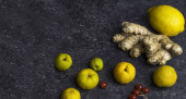 Zdrowa żywność na wzmocnienie odporności i zimne środki zaradcze drewniane tło, produkty bogate w witaminy, minerały, przeciwutleniacze, czyste jedzenie, koncepcja zdrowego stylu życia