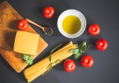Surowe składniki do gotowania tradycyjnego włoskiego makaronu na białym betonowym tle. Makarony, widok z góry.
