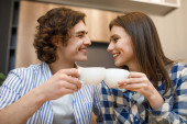 Zdjęcie "Młoda wesoła para dobrze się bawi, karmi się nawzajem podczas śniadania w kuchni." może być wykorzystywane do celów osobistych i komercyjnych zgodnie z warunkami zakupionej licencji Royalty-free. Obraz jest dostępny do pobrania w jakości wysokiej rozdzielczości do 5760x3840.