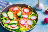 Niemieckie potrawy - tradycyjna sałatka wegetariańska z ziemniakami, pomidorami, cebulą i rukolą