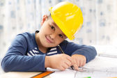 Mały chłopiec w kasku rysunek z ołówkiem i plastikową rurką w warsztacie.