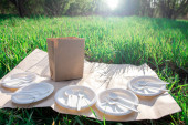 Papierowa torba i pojemniki z jedzeniem na trawie. Zdrowa żywność.