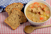 kawałki chleba w zupie warzywnej z kiełbasą i bekonem
