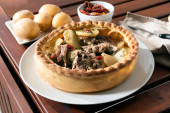 bardzo ładne pieczenie mięsa z ziemniakami, tureckie pikantne na białym talerzu z drewnianego stołu zbliżenie