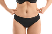 Młoda kobieta w bieliźnie na szarym tle. Koncepcja chirurgii plastycznej