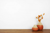 Wystrój wnętrz na półce. Wazony, kaktusy i soczyste rośliny na półce. Półka drewniana pod białą ścianą. Baner z przestrzenią do kopiowania.
