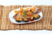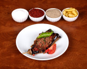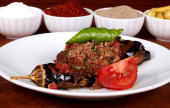 idealny turecki żywności warzywa kebab pikantne na białym talerzu zbliżenie na drewnianym stole