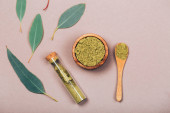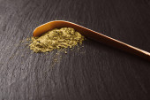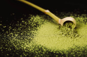Łyżka do herbaty matcha i zielonego poudera w specjalnej ceramicznej kiełbasie. Czarne tło. Zdjęcie wykonane w płaskim stylu świeckim. Skupiamy się na matcha pouder.