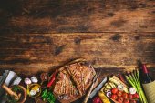 Grillowane mięso, krojony stek z wołowiny z przyprawami, frytki i warzywa na rustykalnym tle