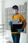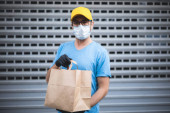 Dostawca z maską ochronną i rękawiczkami trzymający pudełko / torbę z zakupami przed budynkiem.