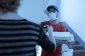 Zdjęcie "Dostawca z maską ochronną i rękawiczkami trzymający pudełko / torbę z zakupami przed budynkiem." może być wykorzystywane do celów osobistych i komercyjnych zgodnie z warunkami zakupionej licencji Royalty-free. Obraz jest dostępny do pobrania w jakości wysokiej rozdzielczości do 5760x3840.