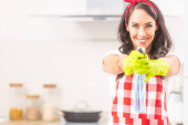 Piękna gospodyni w czerwonym fartuchu, stojąca w lewej części obrazu z kuchnią w tle, uśmiechnięta z rękami skrzyżowanymi na klatce piersiowej.